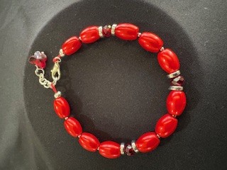 This bracelet features rich red, satin‑luster oval beads, accented with sparkling red crystals and silver spacers, and finished with a coordinating red crystal butterfly charm.