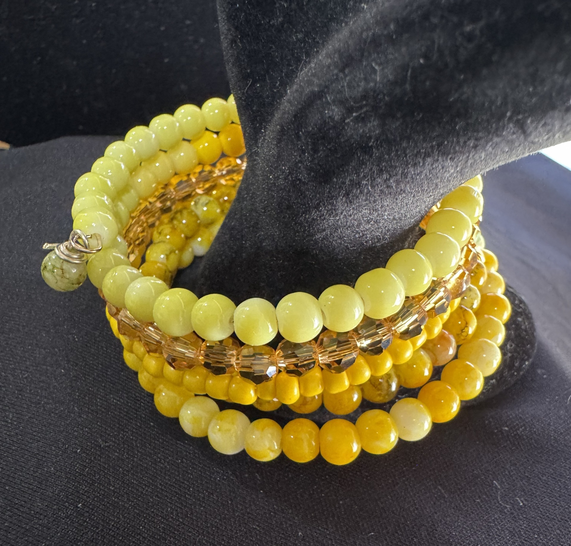This spiral bracelet features a beautiful mix of pearls and shiny glass beads in warm yellow tones. Designed in a flexible coil style, it requires no clasp — simply wrap it around your wrist for an effortless, comfortable fit.