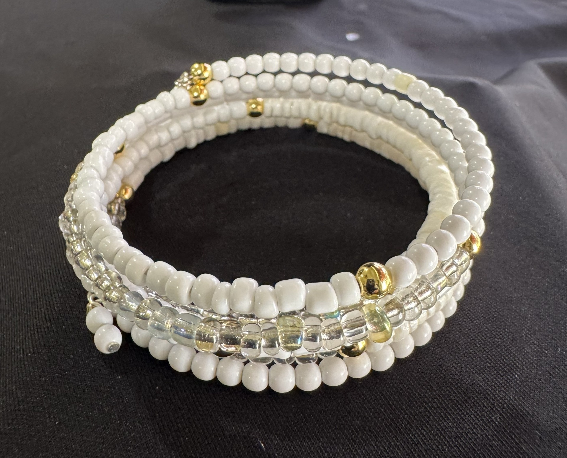 This spiral bracelet features a beautiful mix of white and clear crystal beads, accented with gold spacer beads for a touch of elegance.