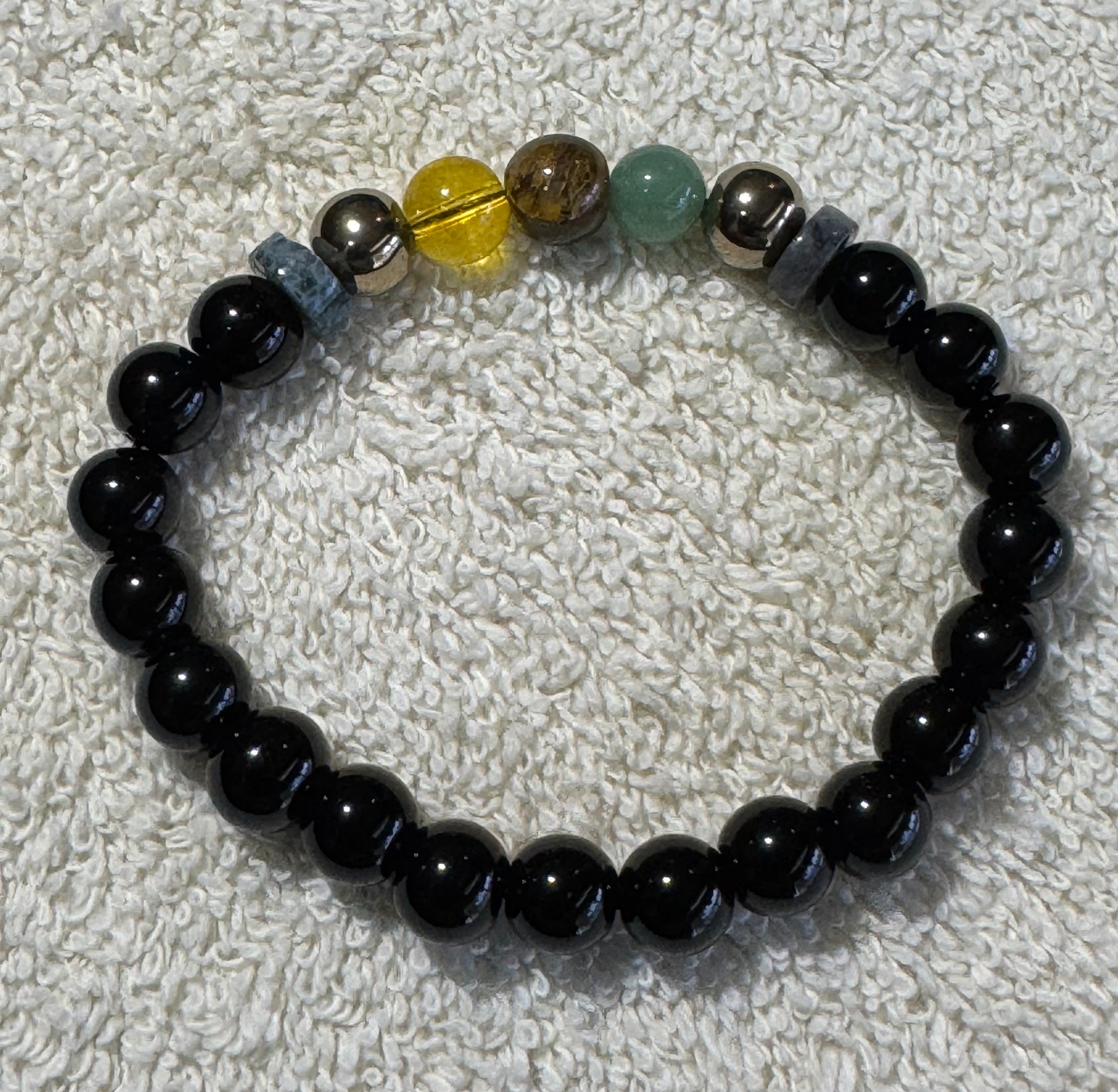 This stretch bracelet—often referred to as a "money bracelet"—is designed to attract wealth, prosperity, and abundance through its powerful combination of crystals and gemstones: Citrine, Pyrite, Green Aventurine, and Tiger's Eye, which are beautifully centered on black onyx gemstones. Ideal for everyday wear, it serves as a stylish reminder to stay aligned with intentions of success and positive energy.