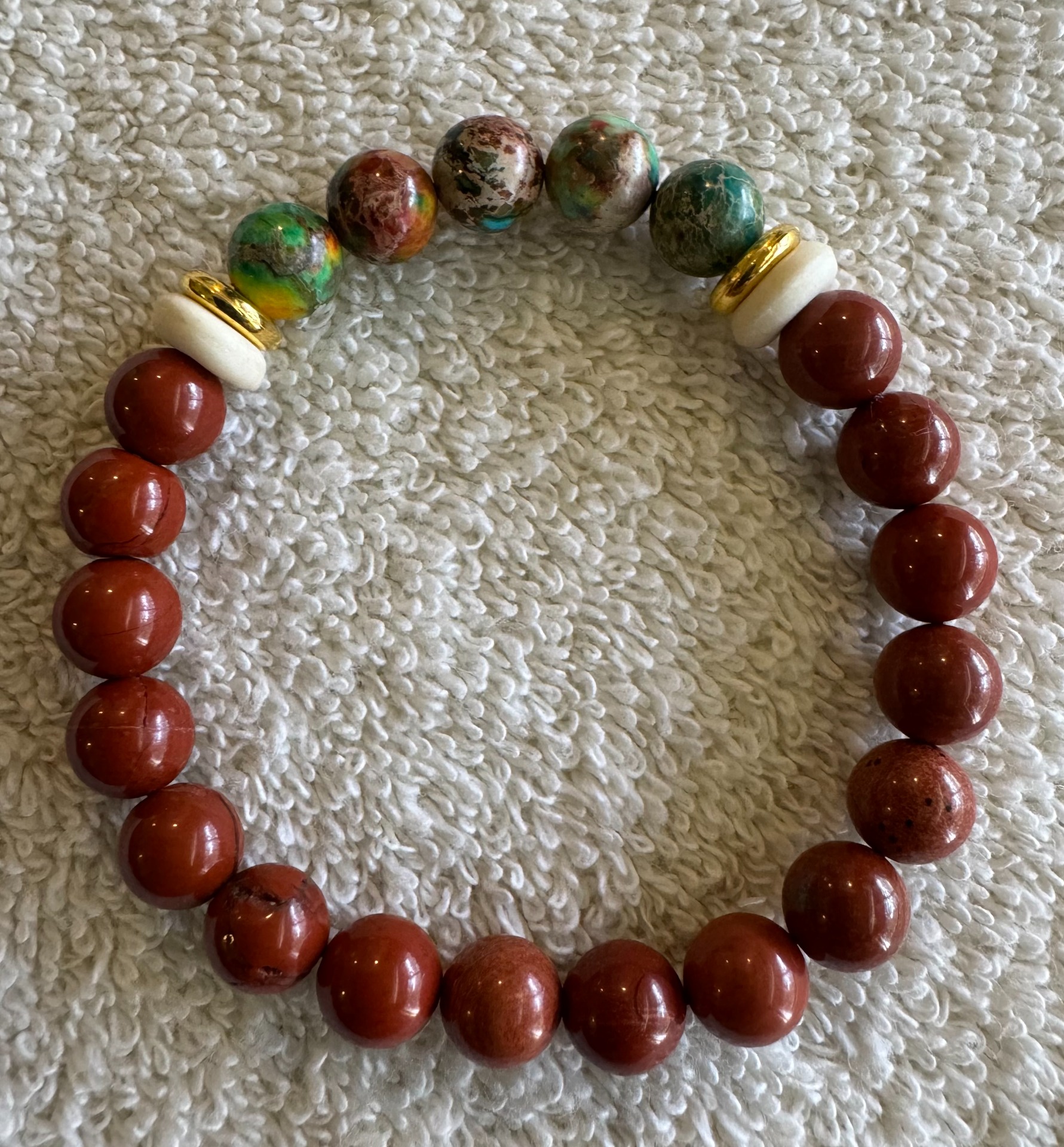 This stretch bracelet is crafted with natural gemstones, featuring rich Red Jasper beads beautifully centered between Green and Blue Imperial Jasper accents. The combination creates a striking balance of earthy warmth and vibrant color—perfect for everyday wear or as a meaningful gift.