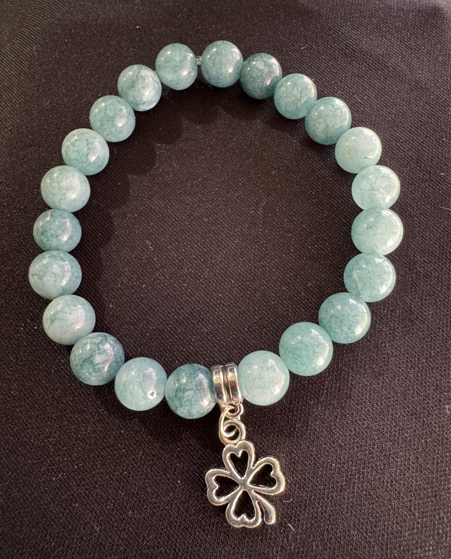 This stretch bracelet is crafted with natural gemstones and accented with a silver‑tone four‑leaf‑clover charm, adding a touch of simple elegance and good‑luck symbolism.
