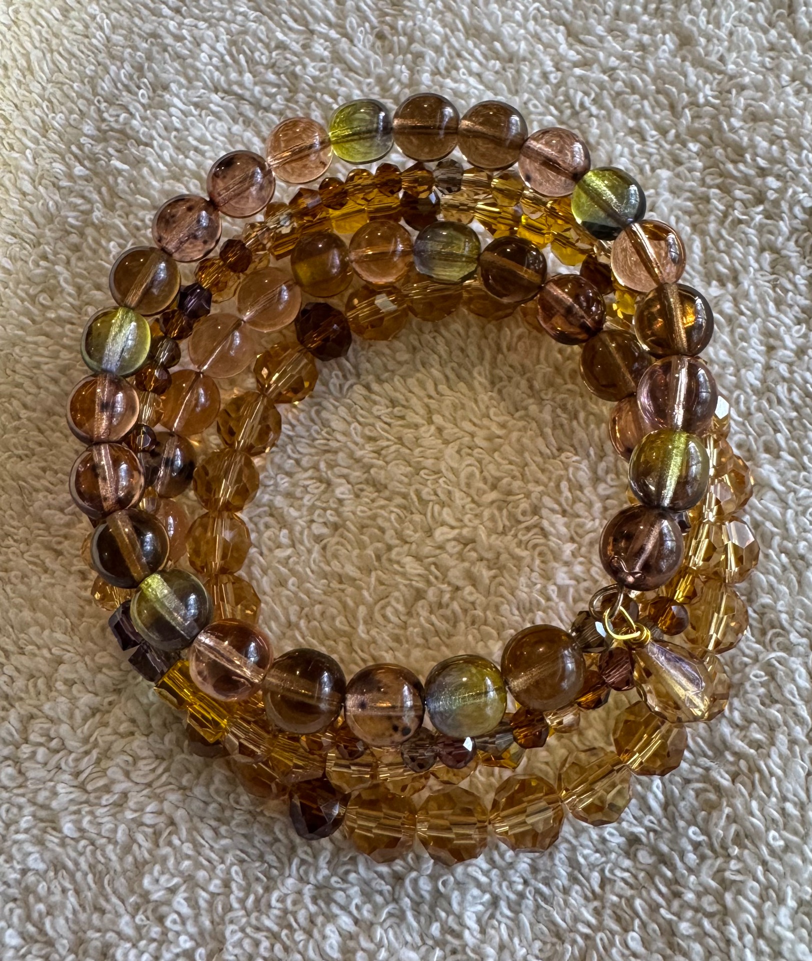 Slip into something radiant—this handcrafted wire-wrapped bracelet features shimmering crystal beads in warm shades of brown and gold, creating a rich, layered look with zero hassle. Designed without clasps, it wraps smoothly around the wrist for a secure fit and graceful movement. Just spiral it on and step out in style.