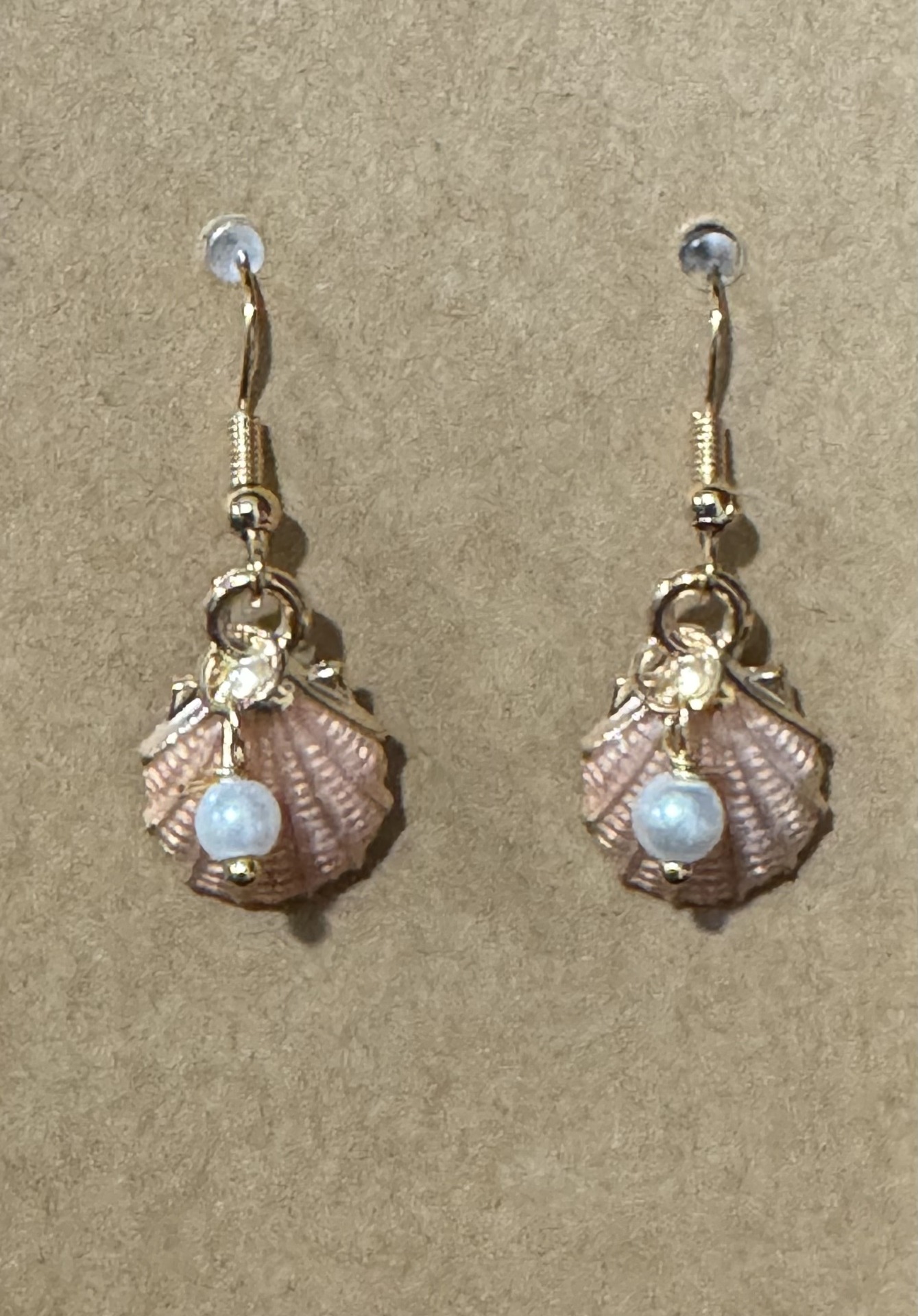 This pair of earrings features shiny pink clam shells with a single dangling pearl on each.