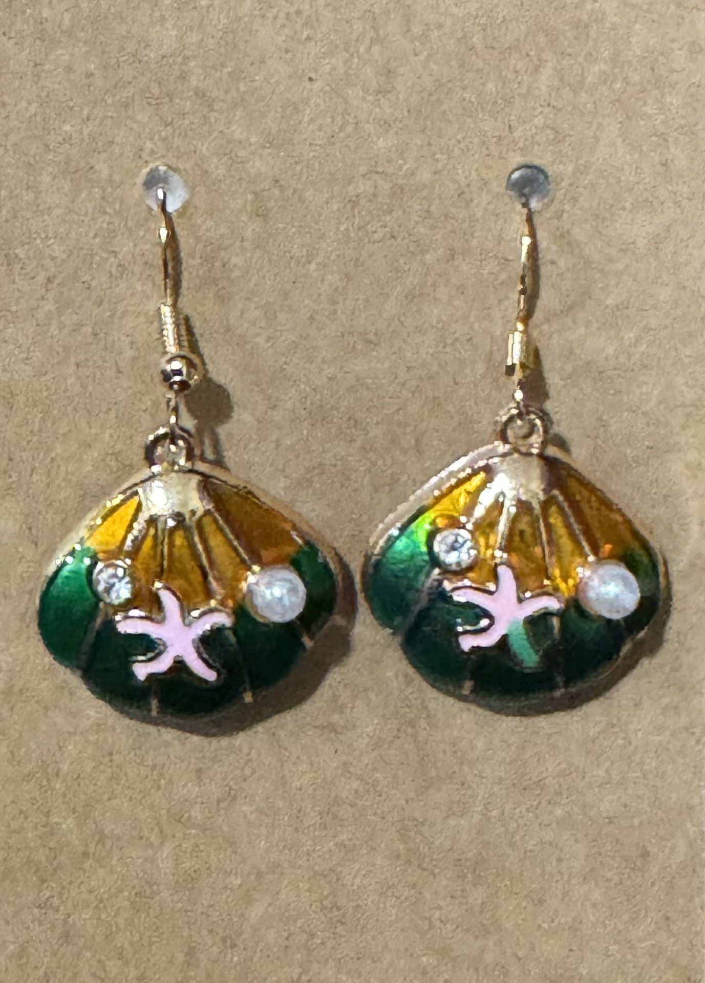 Green and gold seashell on gold enamel featuring a starfish, diamond stud, and pearl.