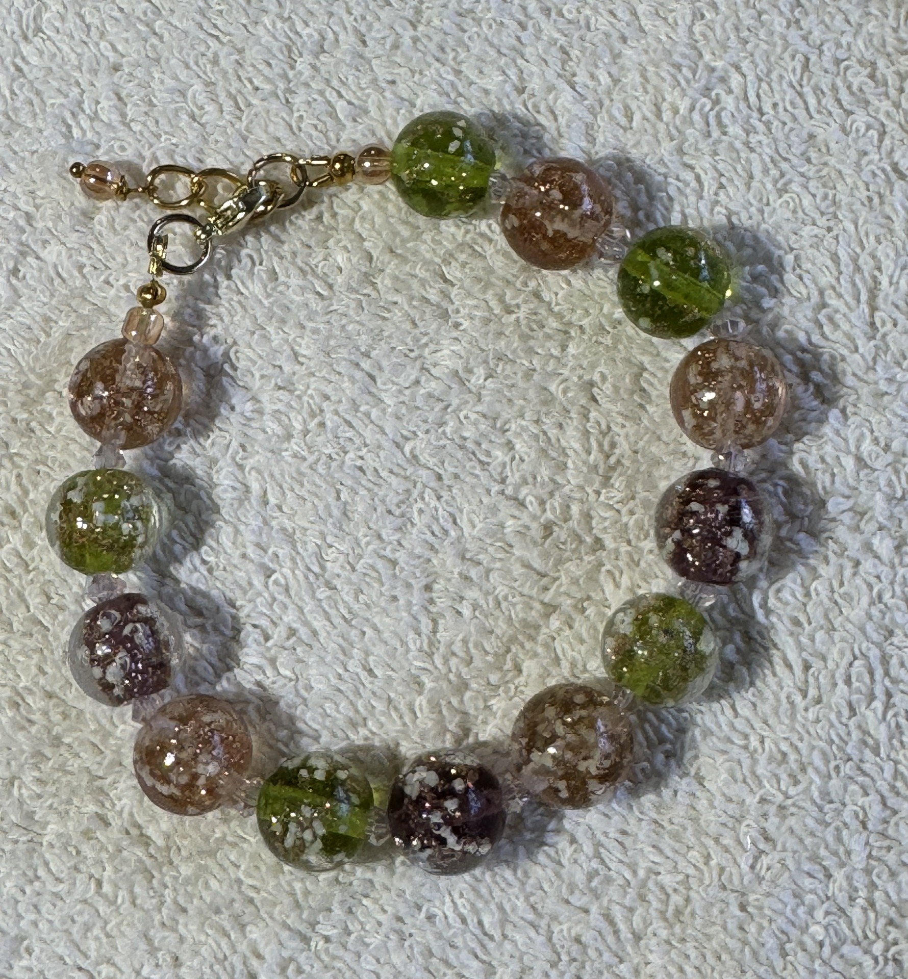 This handcrafted bracelet features multicolored (green-beige-brown) Murano glass beads, celebrated for their vibrant hues and artistic beauty. Paired with tiny glass spacers and a gold-tone clasp with a crystal charm, the design exudes elegance and sophistication. Perfect for adding a bold splash of color and timeless charm to any outfit, this bracelet is a statement piece that showcases the art of fine craftsmanship.