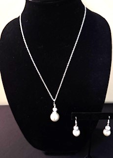 This graceful jewelry set features a pendant necklace showcasing a large, lustrous pearl paired with a sparkling cubic zirconia accent bead. The pendant is suspended from a sterling silver chain, adding a touch of timeless sophistication.