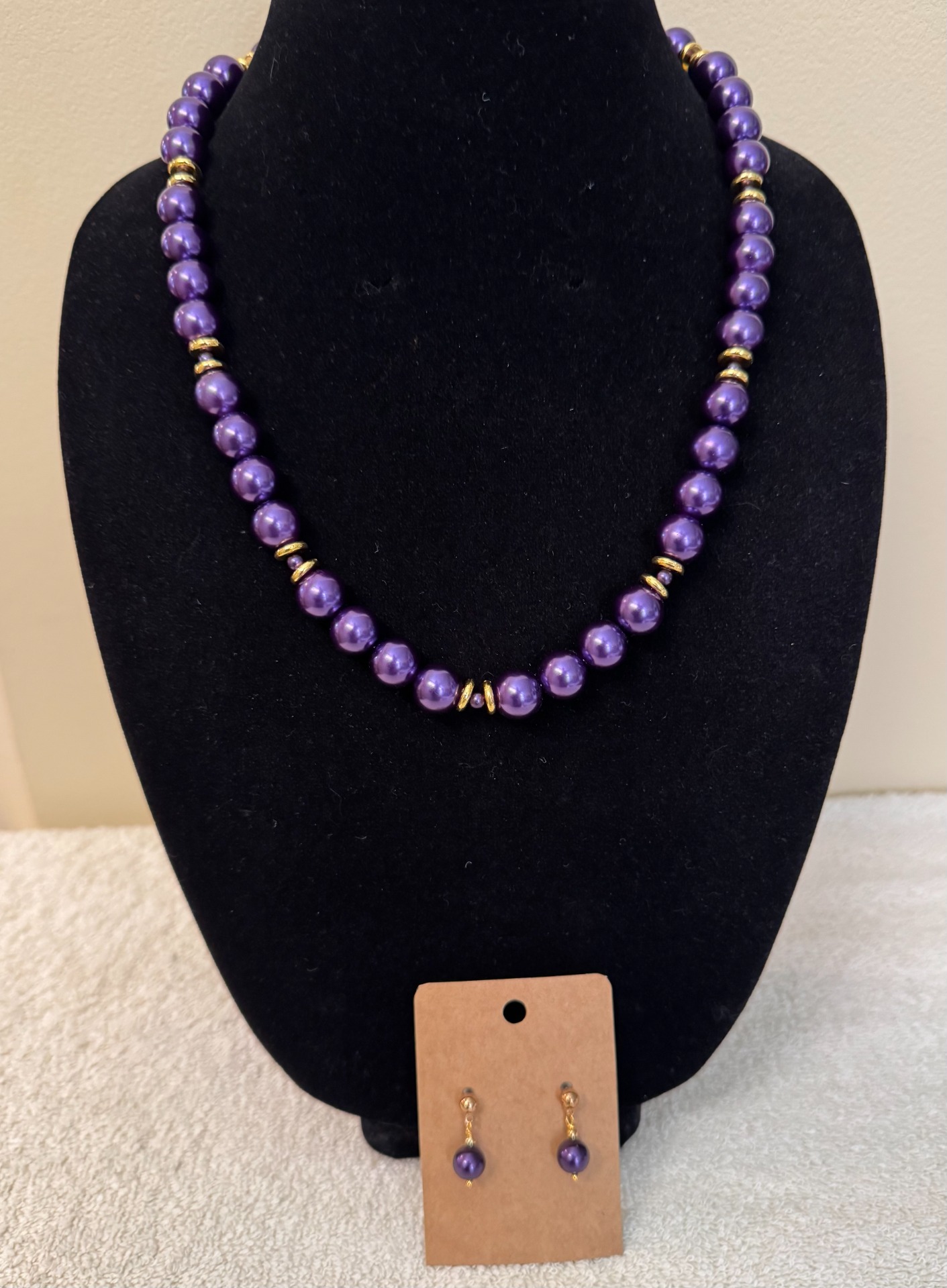This elegant jewelry set features 10mm satin‑luster pearls paired with your choice of gold or silver spacers, creating a timeless and beautifully polished look. The matching drop‑style pearl earrings complete the ensemble with graceful simplicity.