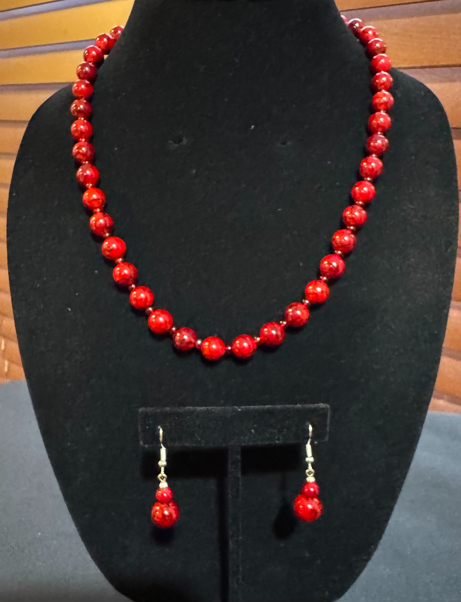 This jewelry set features a necklace and matching earrings of polished natural red turquoise gemstone beads with red crystal spacers.
