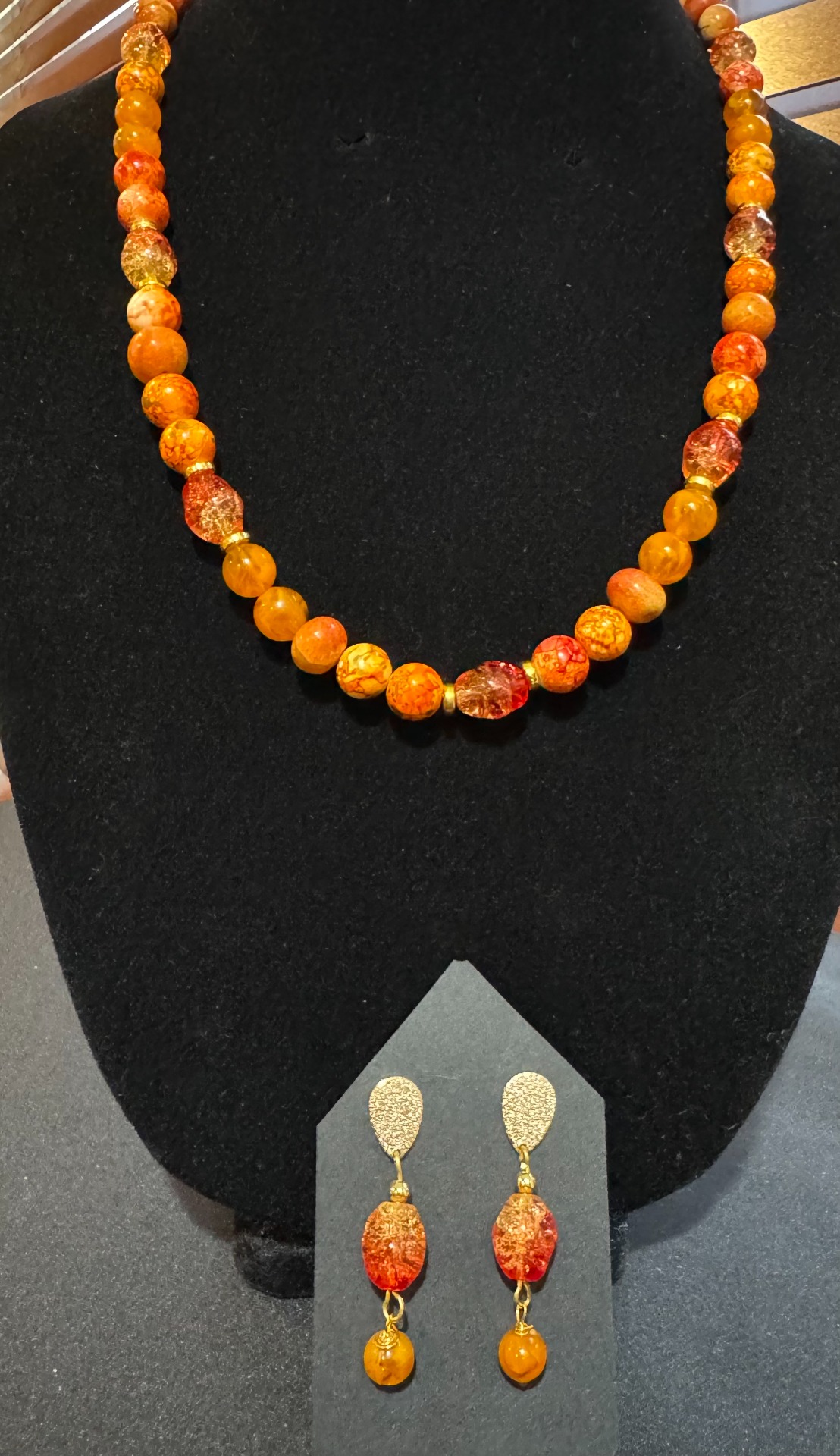This vibrant jewelry set showcases a stunning mix of orange‑hued glass and crystal beads, each chosen for its rich color and luminous sparkle. The necklace's warm, sun‑kissed tones create an uplifting, eye‑catching look that transitions effortlessly from casual days to special occasions.