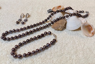 This jewelry set features a hand-knotted necklace with a bracelet and earrings all of brown-colored natural freshwater pearls.