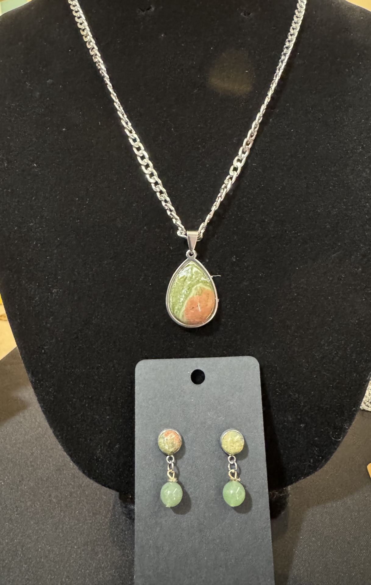 This beautiful jewelry set features a large tear drop natural unakite gemstone pendant, showcasing the stone's distinctive blend of soft greens and warm coral tones. The pendant is suspended from a silver‑tone, non‑tarnish chain that offers lasting shine and everyday durability.