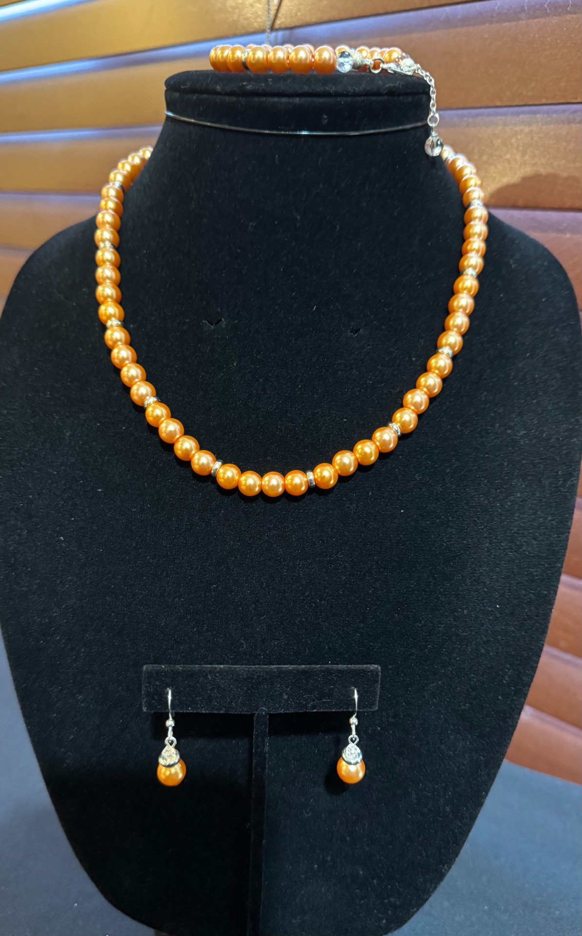 Elevate your look with this elegant jewelry set featuring satin‑luster pearls in a rich, warm orange hue. The necklace showcases beautifully glossy pearls that catch the light with a soft, refined shimmer.