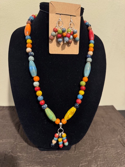 Add a splash of color and elegance to your ensemble with this handcrafted necklace and earring set, designed to captivate from every angle. The necklace features a vibrant array of glossy multicolor beads in varying sizes and shapes, artfully arranged to create a dynamic and playful texture. At its center hangs a striking pendant composed of a circle of the same ceramic beads, offering movement and visual intrigue. The matching earrings mirror the pendant's design, creating a harmonious and eye-catching set that's perfect for both casual flair and special occasions. Whether you're dressing up a simple blouse or adding a bold accent to evening wear, this set brings personality and polish to any look. Each bead is carefully selected and placed to reflect light beautifully, making the entire piece shimmer with life. Made with care and attention to detail, this set celebrates individuality and artistry. No two pieces are exactly alike—each one tells its own story.